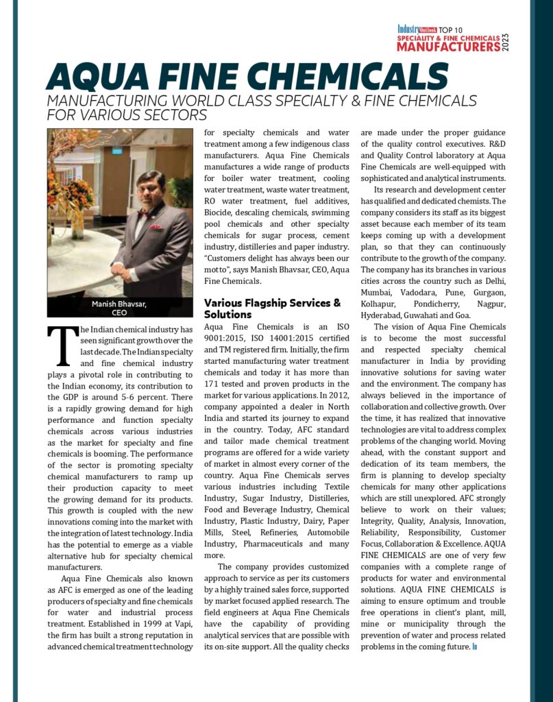 Our journey since 1999 has been one of innovation, dedication, and continuous growth. From our humble beginnings in Vapi, we have evolved into one of India’s leading manufacturers of speciality and fine chemicals, delivering cutting-edge solutions for water and industrial process treatment. The Indian specialty chemical industry plays a critical role in national economic development, and we are proud to contribute meaningfully to this momentum. As the sector witnesses exponential growth, driven by rising demand and technological advancements, Aqua Fine Chemicals stands at the forefront—ready to scale new heights.